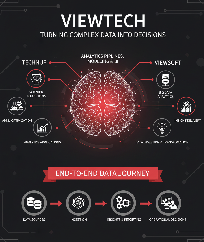 ViewTech will help clients turn complex, multi-source data into decisions via analytics pipelines, BI reporting, dashboards, and advanced modeling. Technuf highlights building analytics applications using scientific algorithms and incorporating AI/ML to optimize BI outcomes, while Viewsoft offers big data analytics services—together enabling everything from data ingestion and transformation to insight delivery and operational reporting.